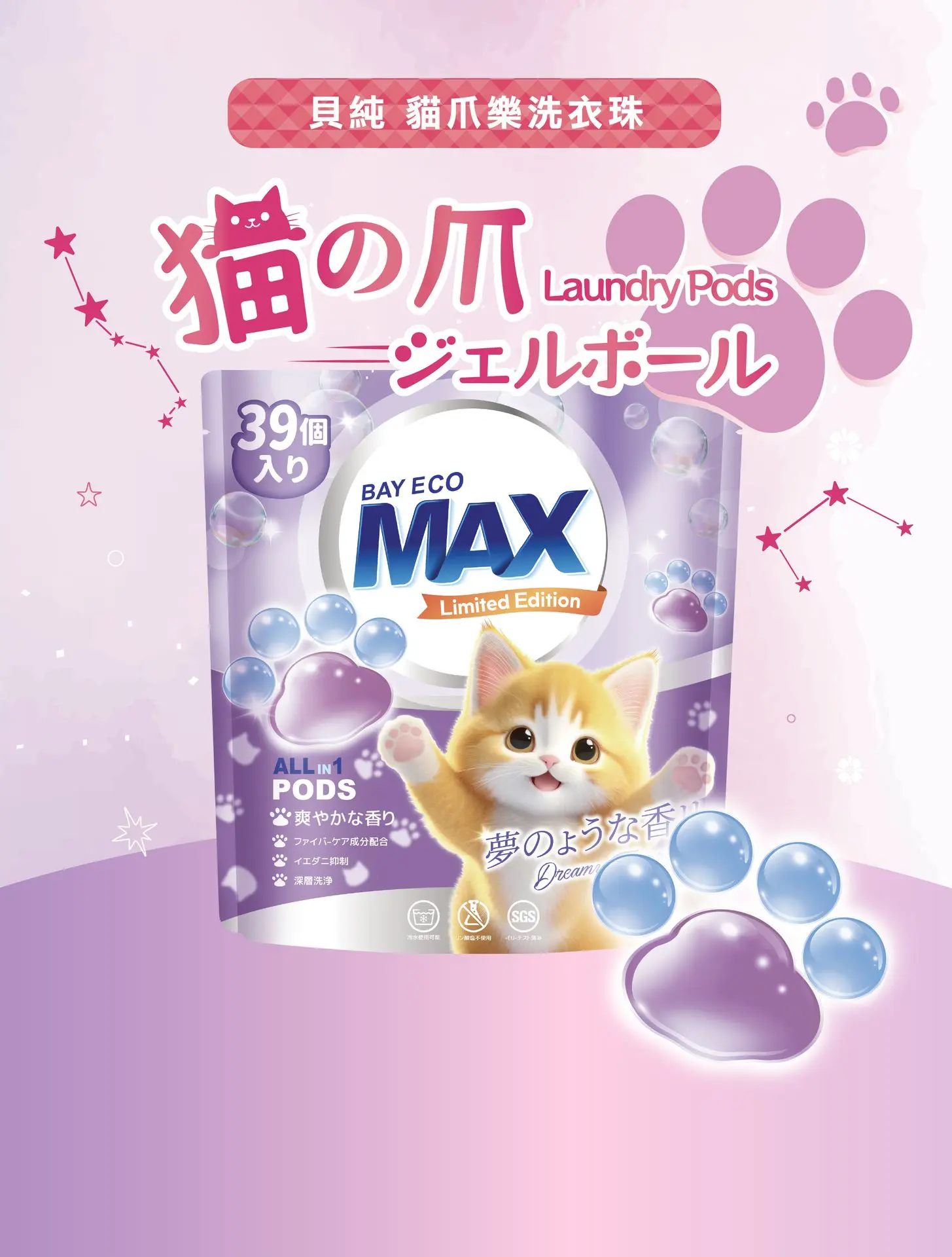 貓咪肉球造型洗衣珠,配合療癒嘅香味令每一次洗衫都充滿期待!深層潔淨衣物同時令衣物散發甜蜜清新嘅香氣!